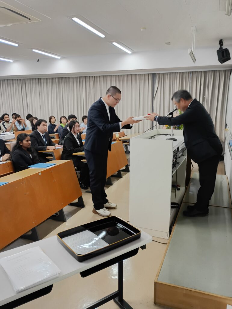 令和7年9月10日(水)、31号館3-33教室にて、別科日本語課程の令和7年度前期修了証書授与式が執り行われました。式には、友永植学長をはじめ、別科日本語課程の教職員、前期修了者11名(中国出身9名、スリランカ出身2名)、そして在学生62名が出席し、温かく厳かな雰囲気の中で進行されました。