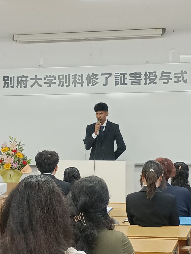 記念品の授与では、修了生を代表してオウ テットウさん(中国)が受け取りました。また、在校生代表としてタルシャ チャモーディヤさん(スリランカ)が修了生に向けて感謝と激励の言葉を述べ、会場は温かい拍手に包まれました。修了生代表の答辞では、リョウ テイゲツさん(中国)が、これまで別科日本語課程で学んできた日々の思い出を振り返るとともに、これからの目標や抱負について力強く語りました。