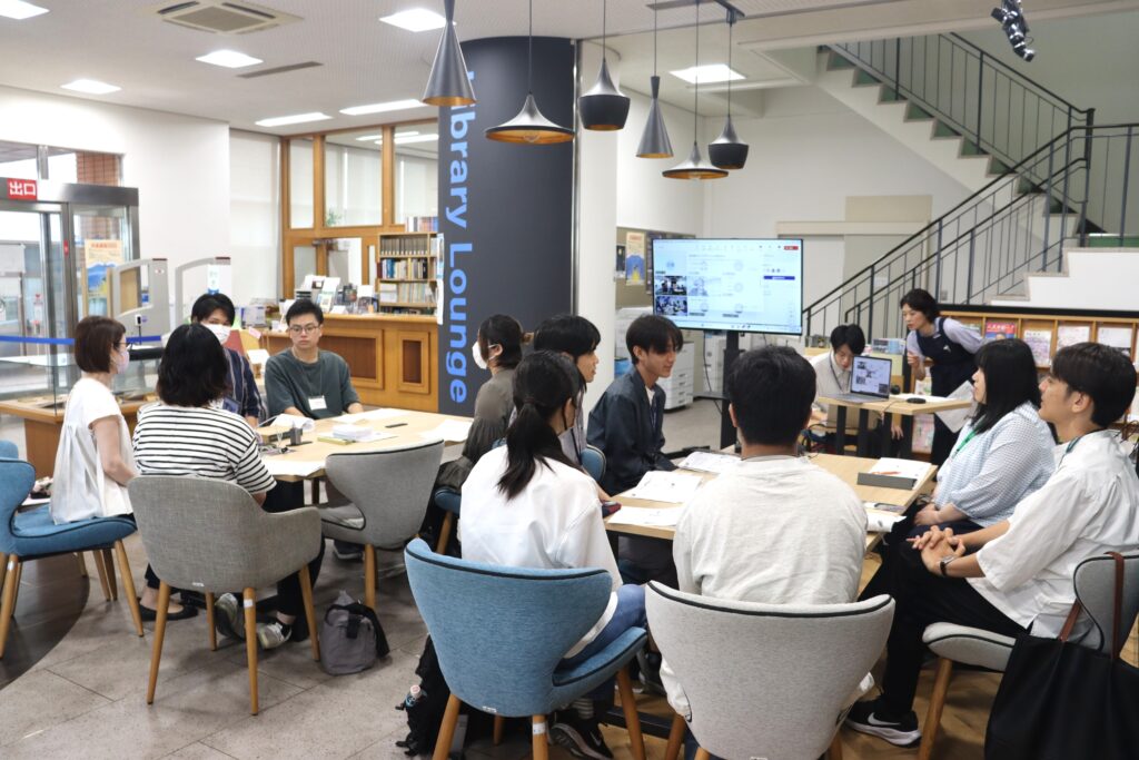 当日は、附属図書館に14名、オンラインで3名、丸善リバーウォーク北九州店(北九州市小倉北区)のセミナールームに7名が参加し、4つのグループに分かれて議論を展開。「奥さんは『私』に惹かれていたのか、それとも『先生』に惹かれていたのか?」というテーマについて、それぞれの視点から考察を行い、活発な意見交換が行われました。