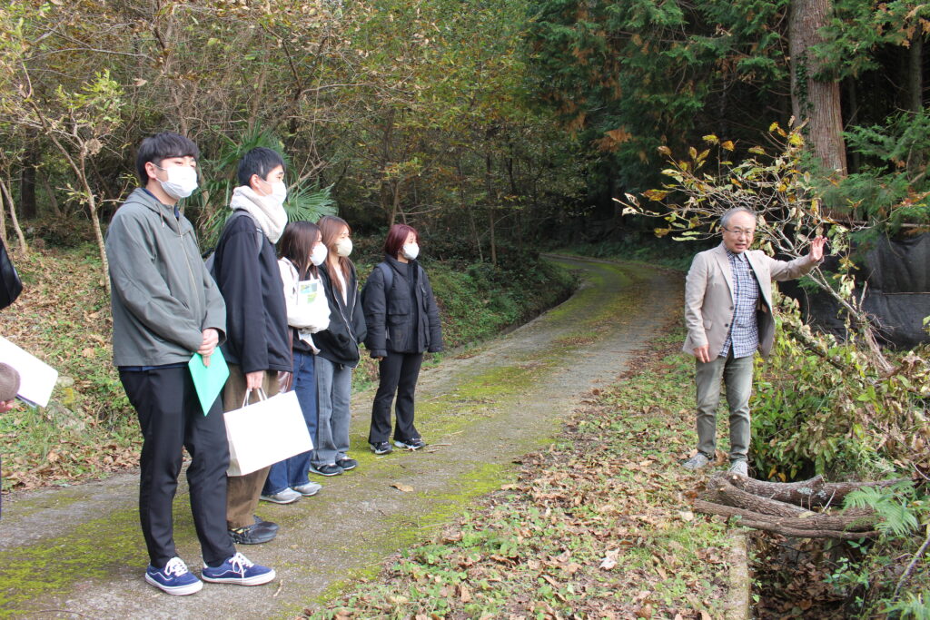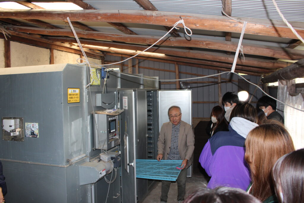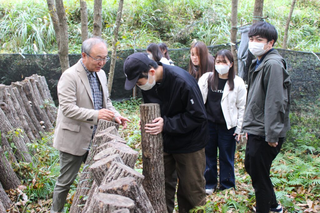 講話の後には、実際のしいたけ生産現場を視察し、現場の状況を直接確認しました。今回の取り組みを通じて、学生たちは生産者の思いや現場の課題を理解し、食育における重要な視点を学ぶことができました。