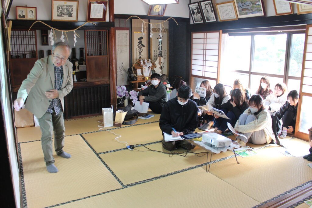 続いて林氏より、大分県における椎茸産業の歴史、原木しいたけと菌床しいたけの特徴、生産方法と環境への影響、生産者が抱える悩みや課題などについて、詳しく丁寧にお話いただきました。さらに、日光による乾しいたけのうま味成分の増加について科学的根拠を交えた説明もあり、学生たちはメモを取りながら積極的に質問し、興味深く学んでいました。