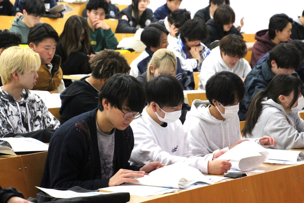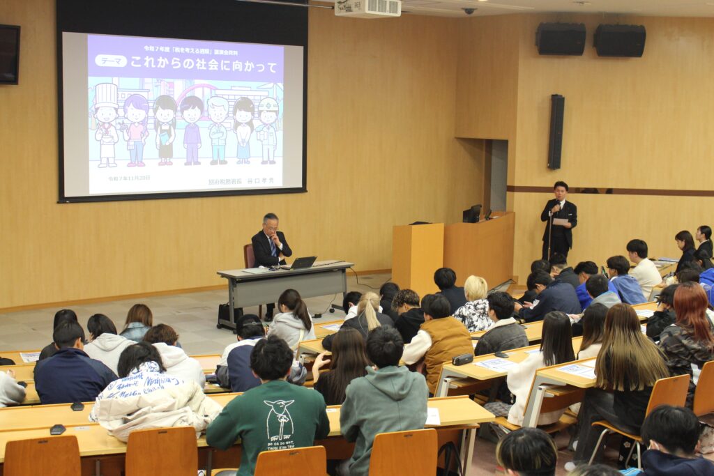 令和7年11月20日(木)、本学国際経営学科では、令和7年度「税を考える週間」(11月11日~11月17日)に合わせ、租税教育の一環として特別講演および模擬体験イベントを開催しました。会場は別府大学石垣キャンパス メディア教育・研究センター メディアホールで、「発展演習2」を履修する学生を中心に約100名が参加しました。
