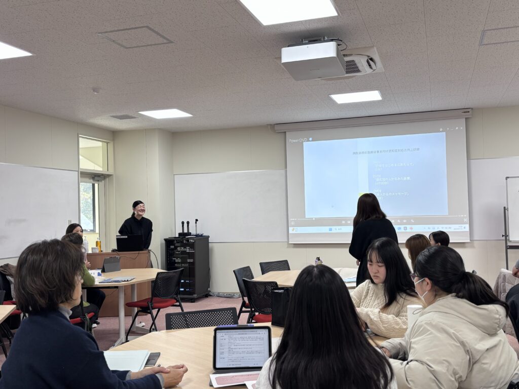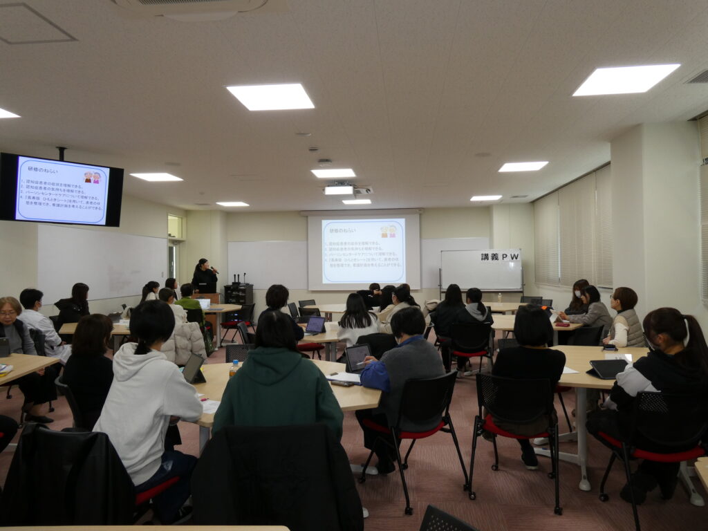 令和8年1月14日(水)、看護学部FD研修として、看護職や看護教員、学生、地域の皆さまを対象に、「認知症看護~認知症を持つ人の“その人らしさ”を考えたケアを一緒に学びませんか~」を開催しました。今回は、国東市民病院の認知症看護認定看護師である坂本理恵氏を講師にお迎えし、認知症のある方への関わり方について学びました。研修は、認知症の基礎を学ぶ理論編と、実際のケアにつなげる実践編の二部構成で行われ、認知症を初めて学ぶ学生にも理解しやすい内容でした。