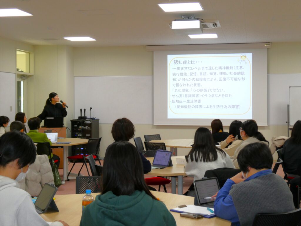 講義では、認知症の症状だけに目を向けるのではなく、その人の気持ちやこれまでの生活、人生に目を向けることの大切さが伝えられました。また、一人ひとりの思いや背景を丁寧にくみ取る関わりが、安心感や信頼につながり、より良いケアにつながることを学びました。参加者にとって、認知症ケアについて改めて考える貴重な機会となりました。