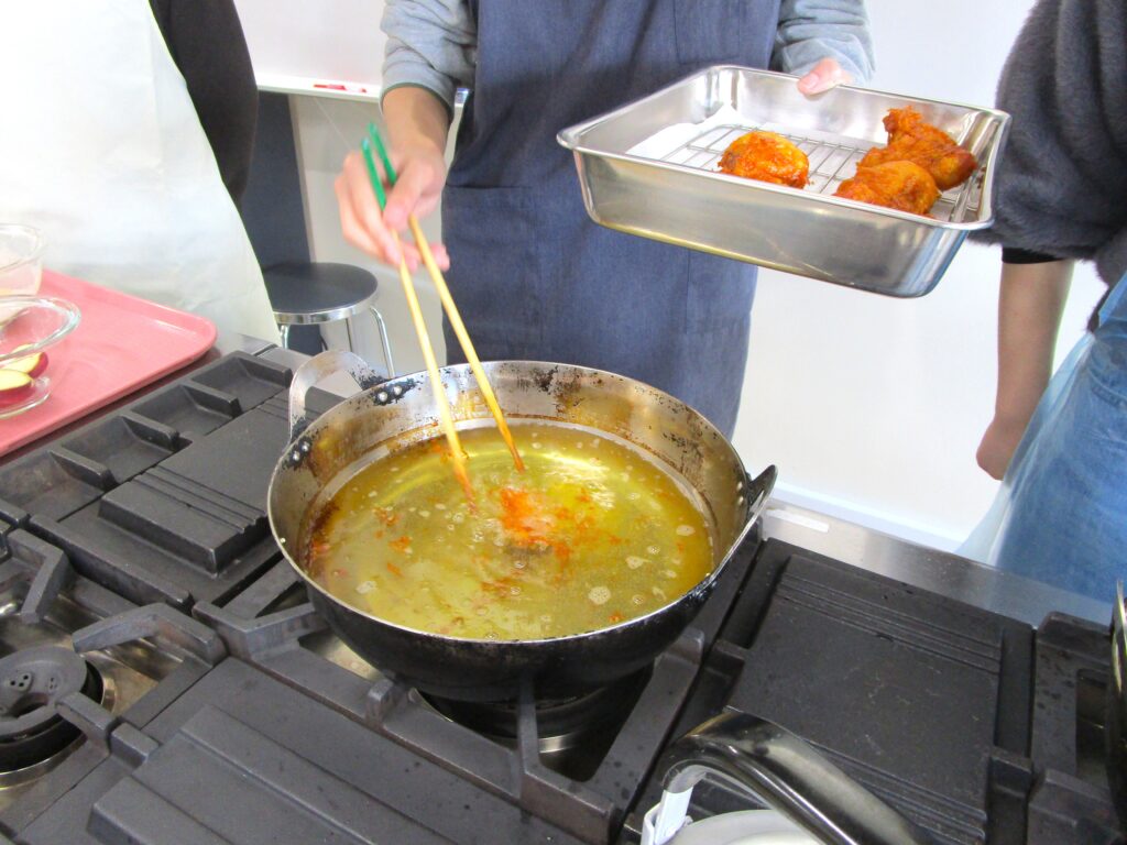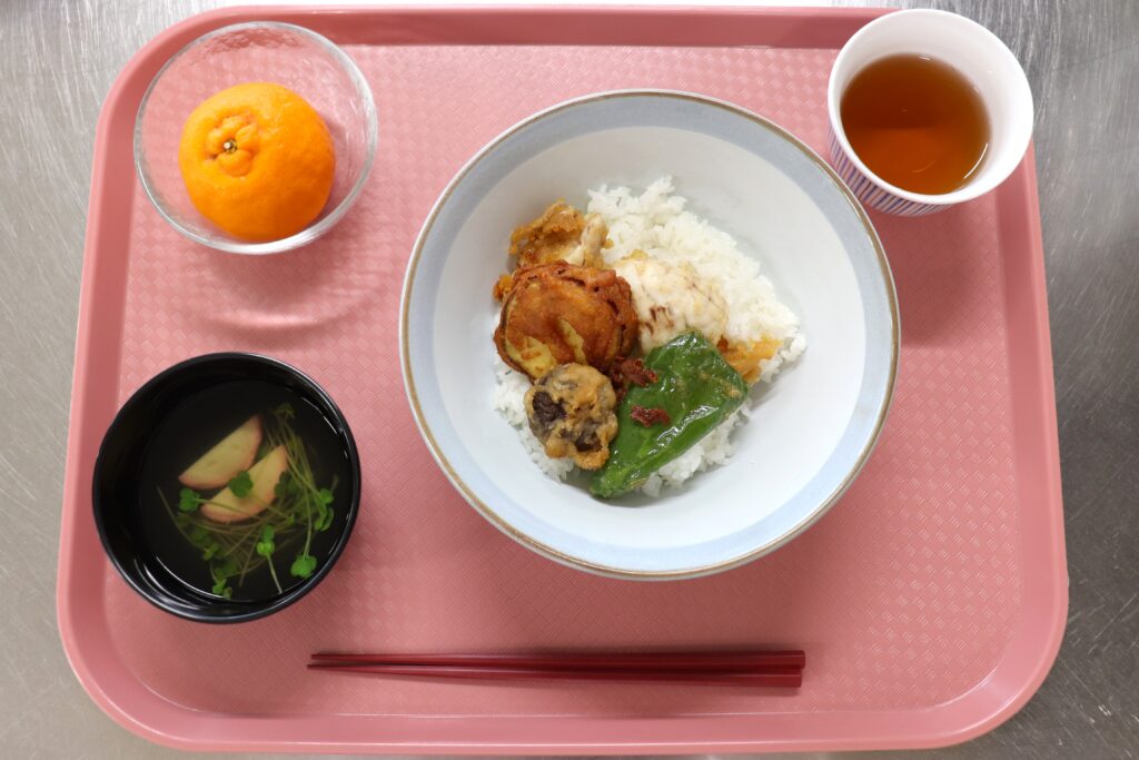 続いて、未利用魚の一つであるクロサバフグを使った「クロサバフグ天丼」の調理実習を行いました。参加者は講師の指導のもと調理に挑戦し、出来上がった天丼をみんなで試食しました。クロサバフグはふっくらとした食感で、参加者からは「とても美味しかった」との声が聞かれました。