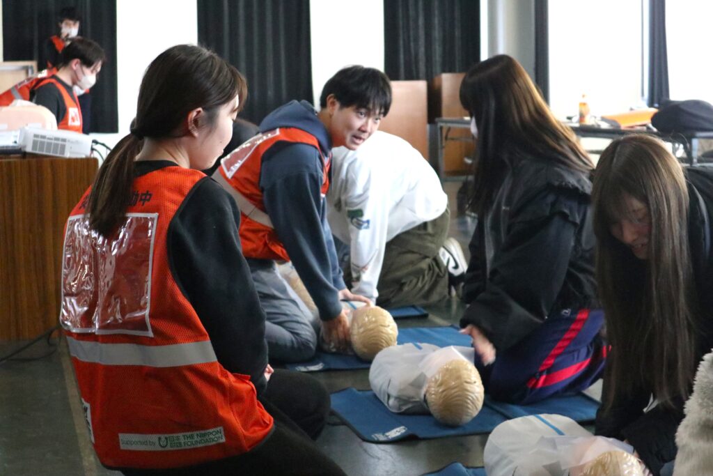 研究会の学生は「応急手当普及員」の資格を取得しており、授業や保育園でAEDの使用方法、胸骨圧迫、人工呼吸などの指導を行っています(当日はビブスを着用して活動しました)。