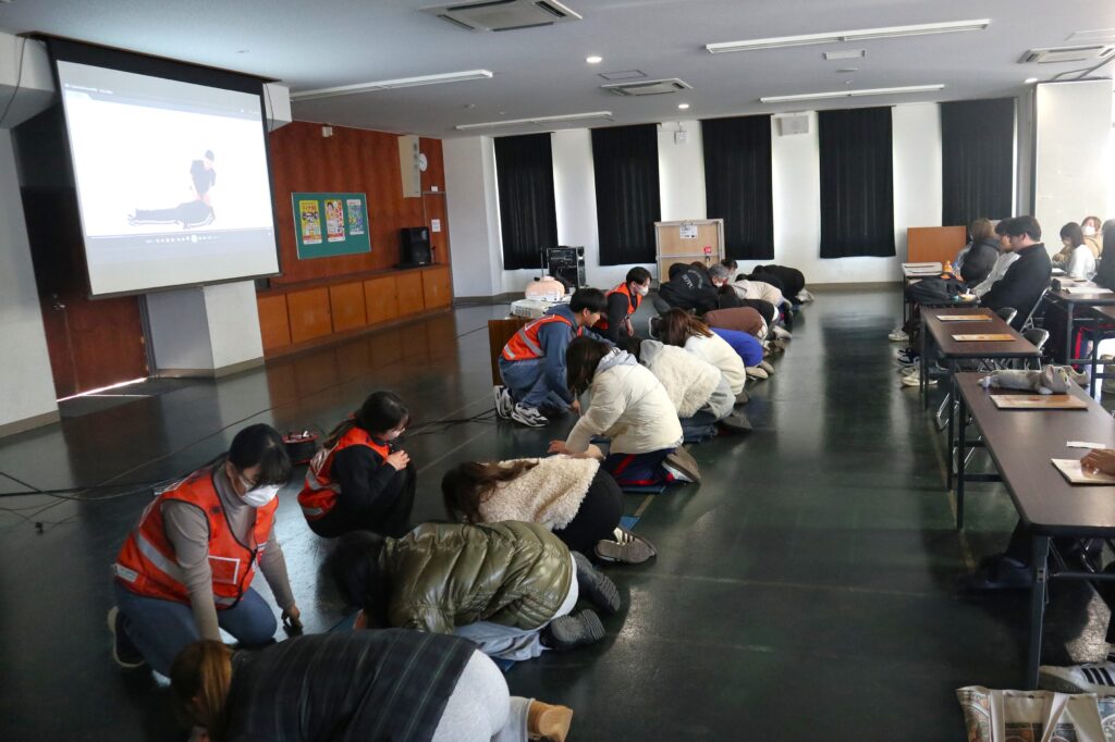 緊張感のある場面もありましたが、同年代の指導者による声掛けが学生の安心感につながり、全員が傷病者発見からAED使用までの一連の救命活動を体験しました。さらに、乳児に対する救命方法も学び、4月から教職・保育士・幼稚園教諭として現場に立つ学生にとって重要なスキルを身につける機会となりました。