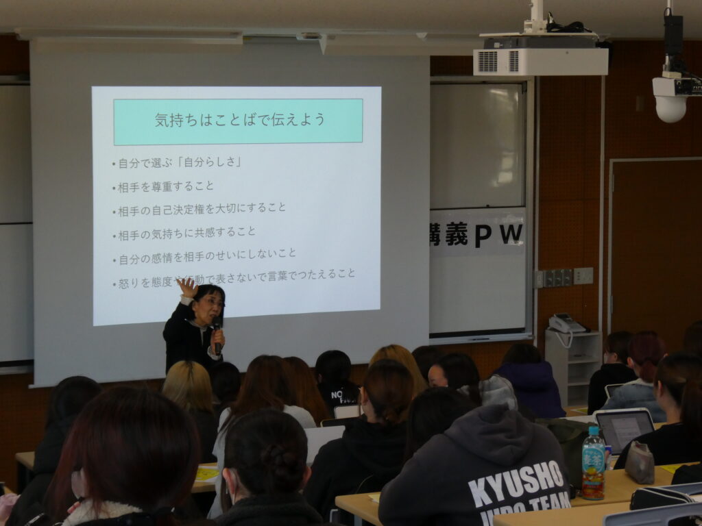 令和7年12月9日(火)、看護学部1年生を対象に佐藤敬子氏(本学客員教授/ナラティブナラティブ・コミュニケーション教育研究所所長)を講師に迎え「デートDV防止セミナー」 を開催しました。大学生活に慣れ、人間関係や行動範囲が広がるこの時期に、あらためて身近な人との関係性を振り返り、自分と相手を大切にする関わり方について考えてもらうことを目的として企画しました。