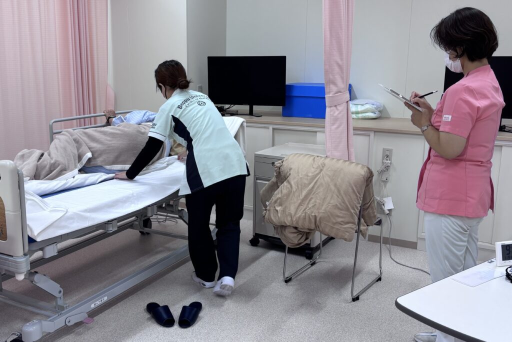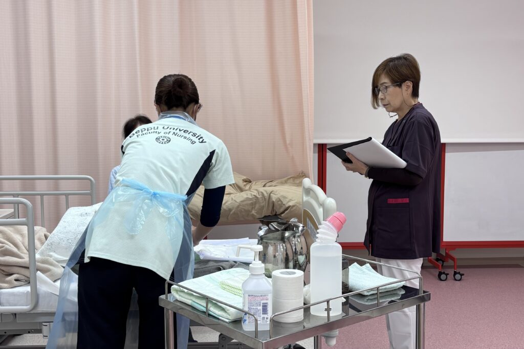 令和8年1月13日(火)、19日(月)の2日間をかけて、1年生を対象に技術チェックを実施しました。今回の技術チェックでは、豊の国医療教育ボランティア会(豊の国SP研究会)の皆さまに模擬患者としてご協力いただき、実際のケア場面を想定した状況の中で行いました。教員は学生一人ひとりの実践を丁寧に確認し、技術の正確さだけでなく、対象者への関わり方や配慮の姿勢も含めて評価しました。