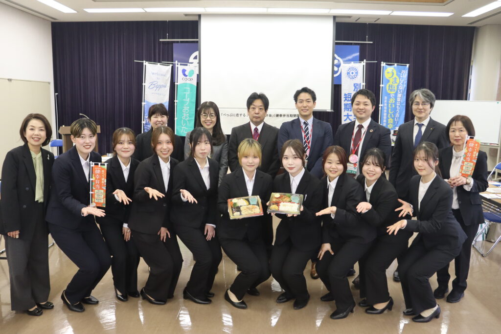 本学食物栄養科と、別府市いきいき健幸部健康推進課・生活協同組合コープおおいたが連携し、食物栄養科 海陸留美 教授の指導のもと、ゼミ生9名 がメニューを考案した「べっぷに恋する♡地獄めぐり弁当」Ver.2の販売が始まりました!県内コープおおいた5店舗で期間限定発売中です!