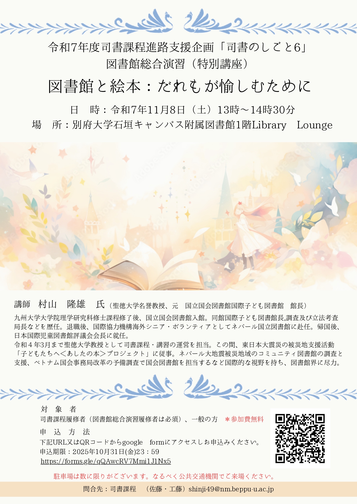 この度、別府大学司書課程では、 公開講座司書のしごと6「図書館と絵本:だれもが愉しむために」を開催いたします。