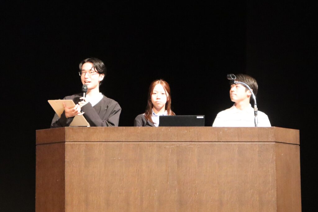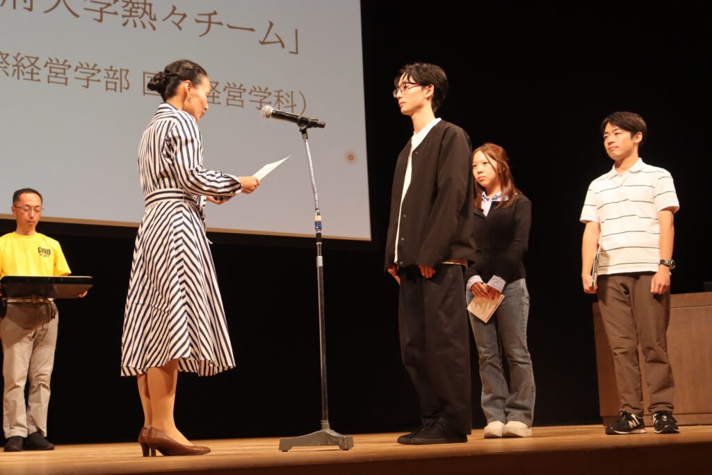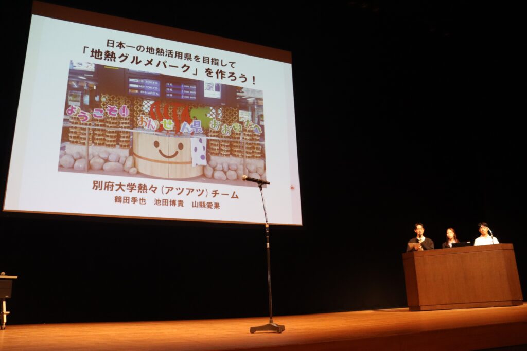 本学からは、国際経営学科に所属する鶴田季也さん(3年)、池田博貴さん(3年)、山縣愛果さん(1年)の3名が登壇し、「地熱グルメパークを作ろう!」をテーマに、地熱を活用した地域活性化のユニークなアイデアを発表しました。応募総数6組の中から見事優秀賞に選ばれ、会場では多くの来場者の注目を集めました。