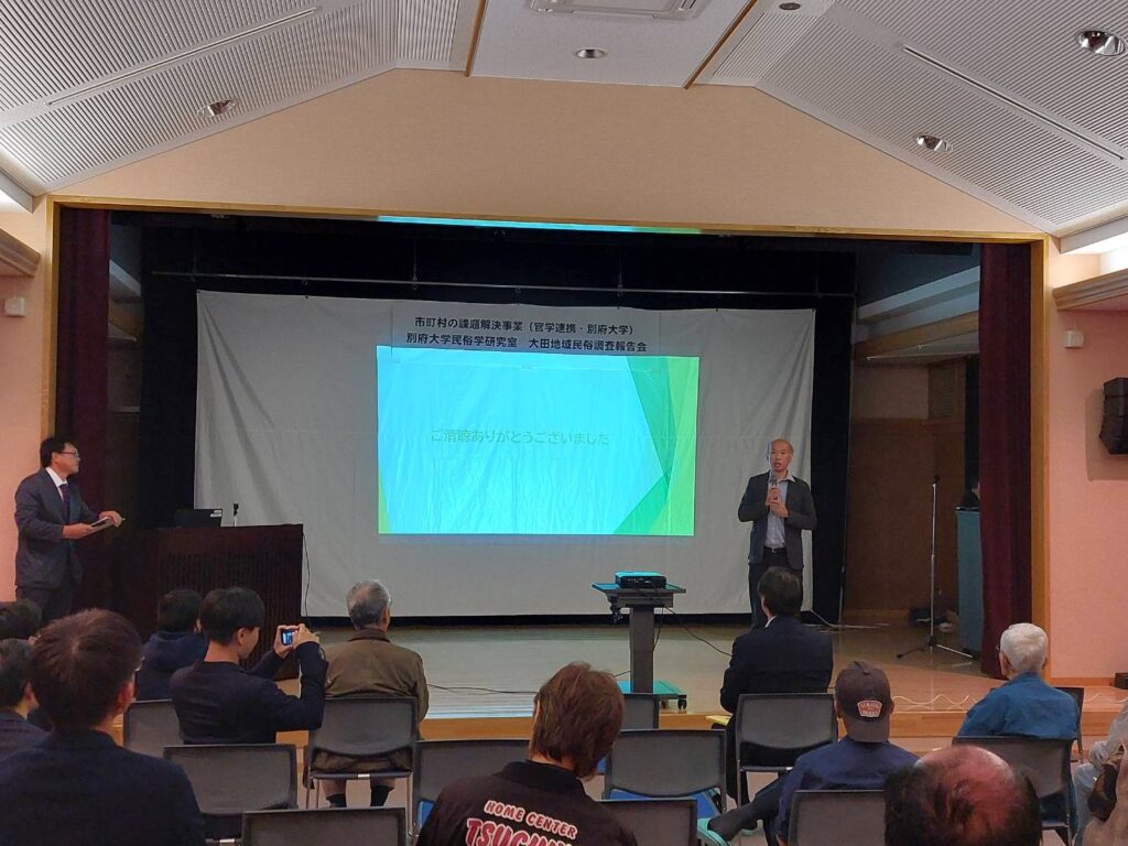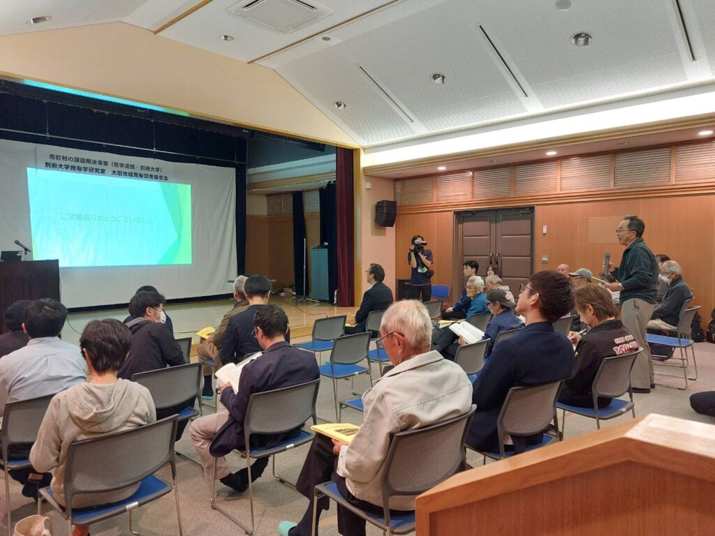 令和7年10月26日には、杵築市役所大田庁舎にて調査報告会が開催され、調査にご協力いただいた地域住民16名が参加されました。当日は、大分合同新聞や地元ケーブルテレビによる取材もあり、地域の関心の高さがうかがえました。