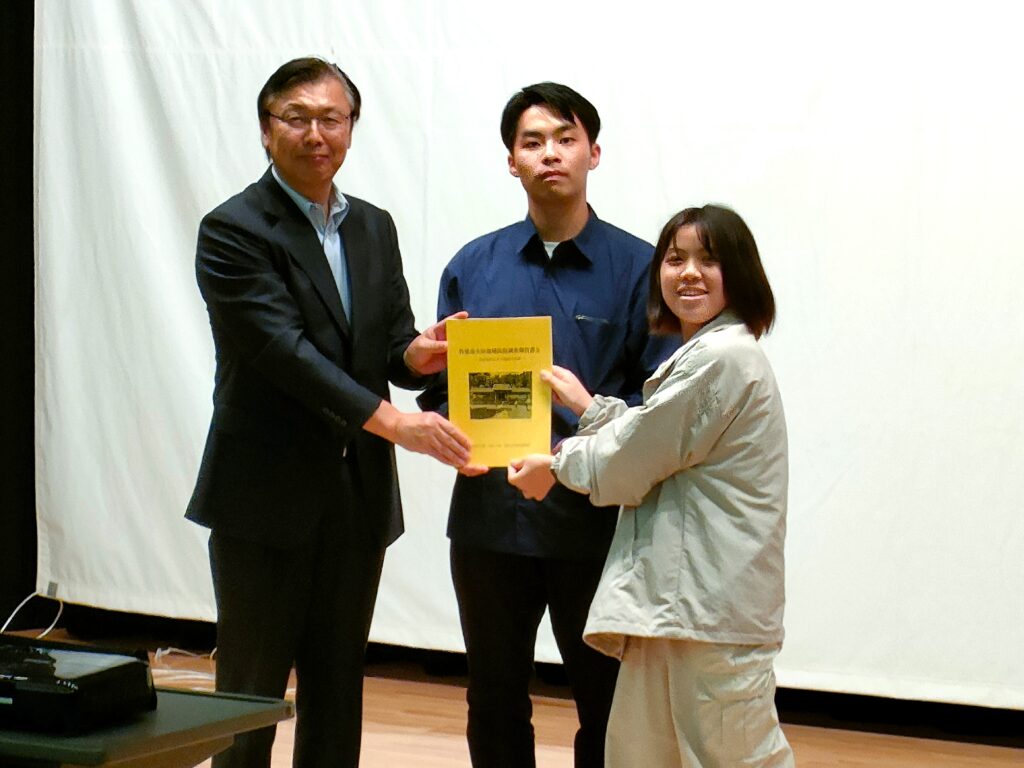 報告会に先立ち、史学・文化財学科2年の丸尾 智幸さんと上 美優さんが、佐々木潤一郎杵築市教育委員会教育長へ調査報告書を贈呈しました。この報告書は、別府大学学長裁量経費により作成されたものです。