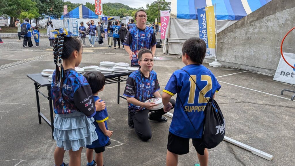 このブースでは、子どもたちに積極的に声をかけながら、フライングディスクの体験をサポートしました。参加者が楽しめるように、ルールの説明や投げ方を指導するなど、工夫を凝らした対応が見られました。