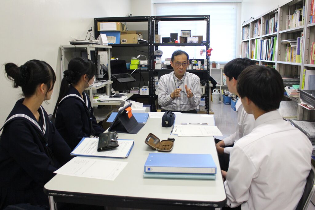 当日は、初等教育科の久保田圭二教授より全体の流れについて説明があり、その後、生徒は4名ずつ10班に分かれて、各班ごとに異なる研究テーマに取り組みました。各キャンパスにて指導教員の研究室を訪問し、テーマに応じた専門的な指導・助言を受けました。