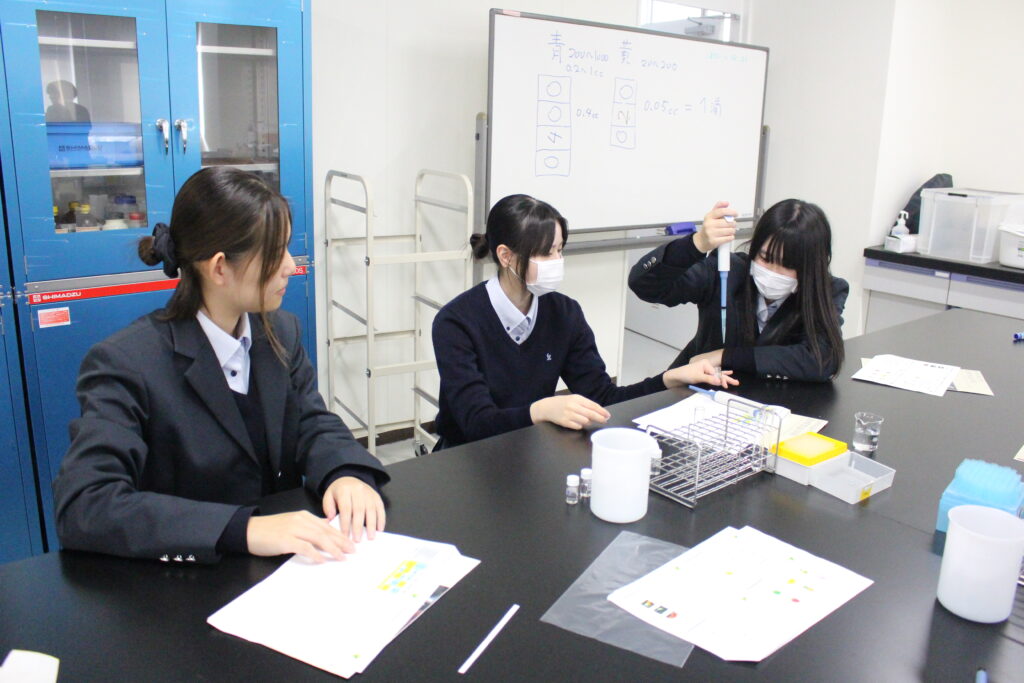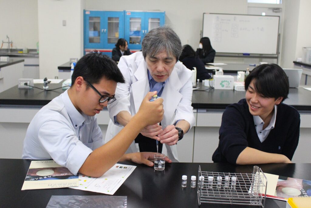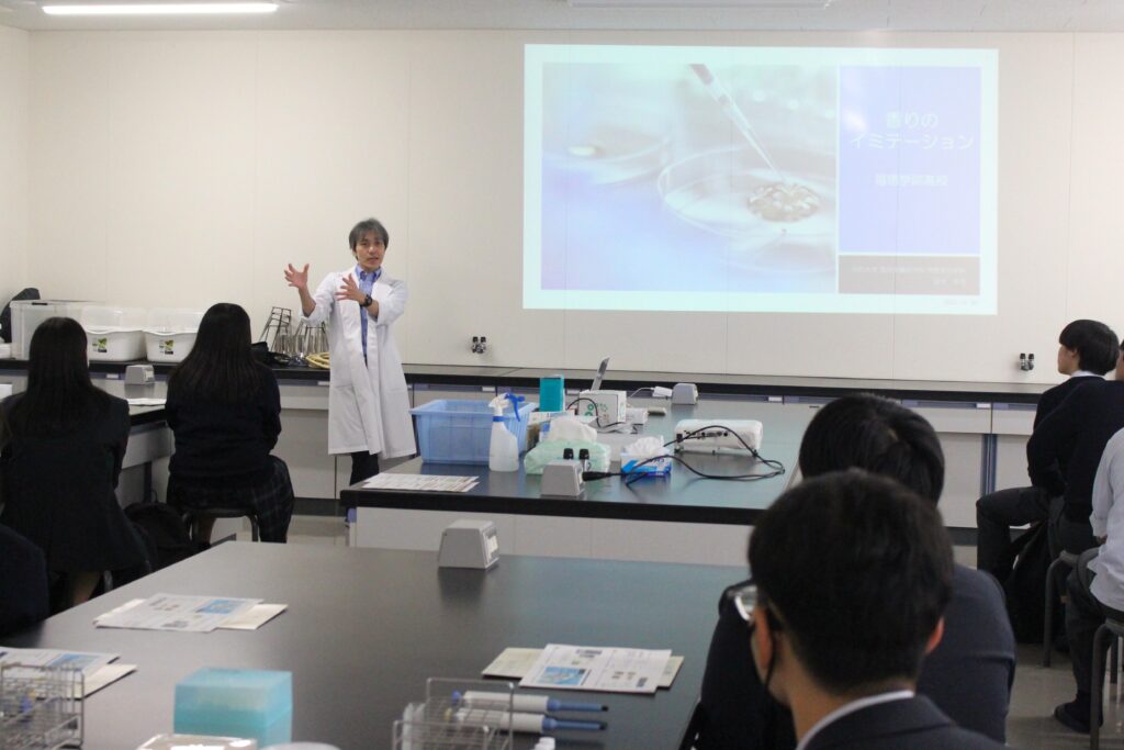 午後からは、発酵食品学科の坂本幸司教授による「フルーツフレーバーのイミテーション」と題した授業を受講。食品に使われる香料のフレーバーについて、実験形式で学びました。授業では、香りの種類や構成について学んだ後、7種類の香りを混ぜ合わせてリンゴやバナナ、パイナップルなどの香りを再現する体験を行いました。生徒の皆さんは、香りの魅力に触れながら、楽しそうに授業に取り組んでいました。