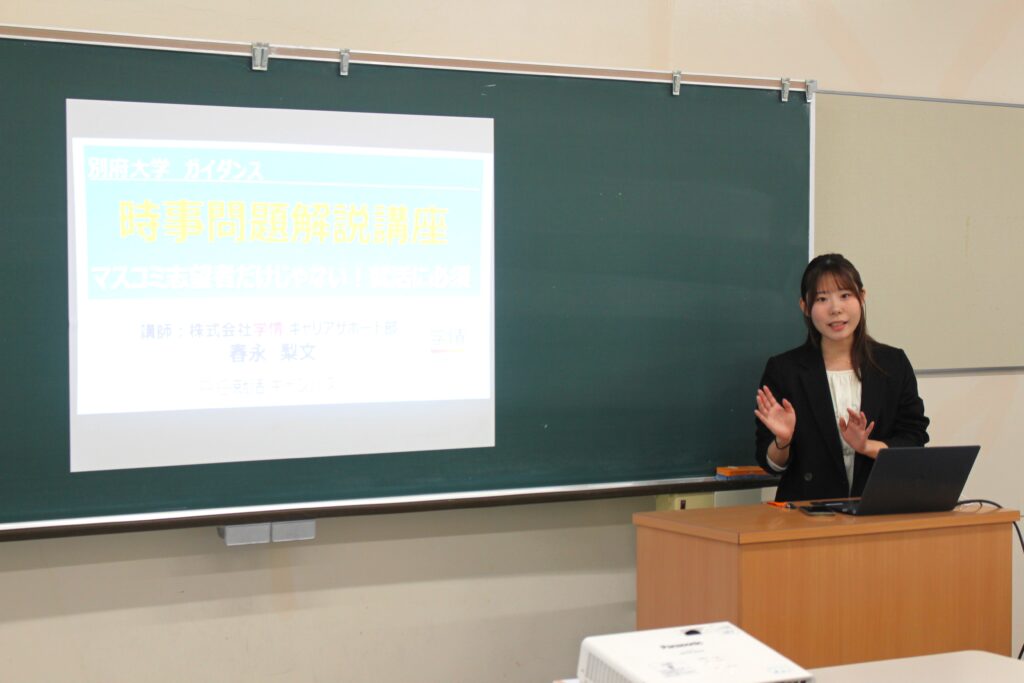 初日は「時事問題」をテーマに、株式会社学情キャリアサポート部の春永梨文さんを講師に迎え、「時事問題解説講座」を開催しました。