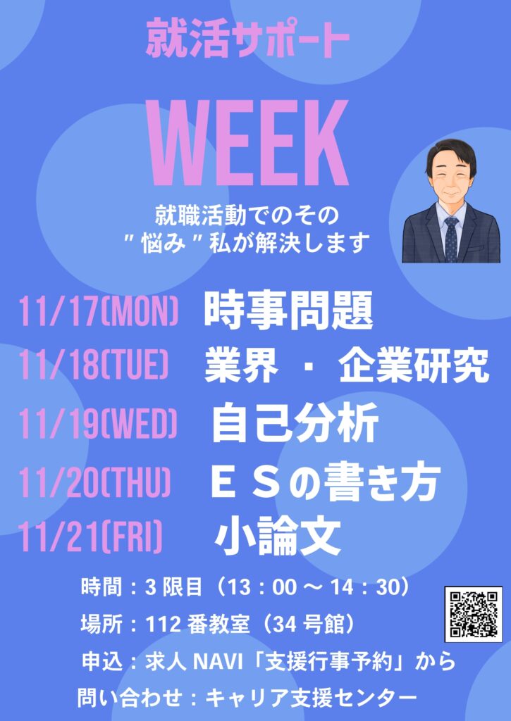 令和7年11月17日(月)~11月21日(金)、キャリア支援課では「就活サポートWEEK」を開催し、皆さんの就職活動を全力で応援します。