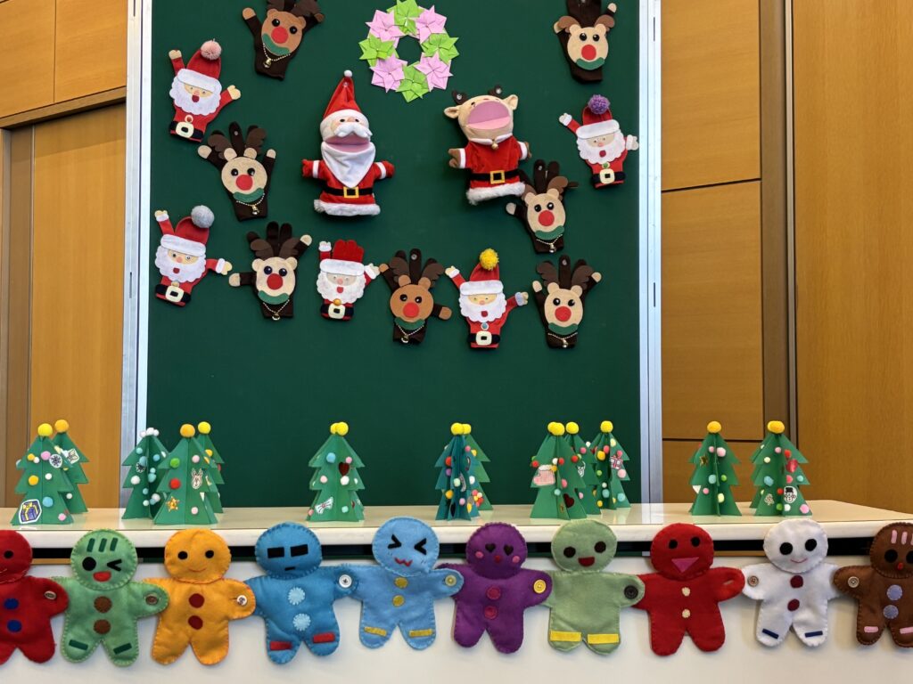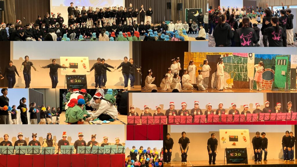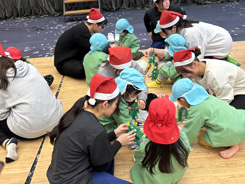 当日は、別府市内の保育園・こども園から約40名の園児と先生方、保護者の皆さまが来場し、研究会からは約100名の学生が参加しました。ハンドベル演奏や劇、パネルシアターなど多彩なプログラムに、会場は子どもたちの笑顔でいっぱいに。後半には、みんなでクリスマスツリーを制作し、歌やダンスを楽しむなど、広場全体が温かく華やかな雰囲気に包まれました。