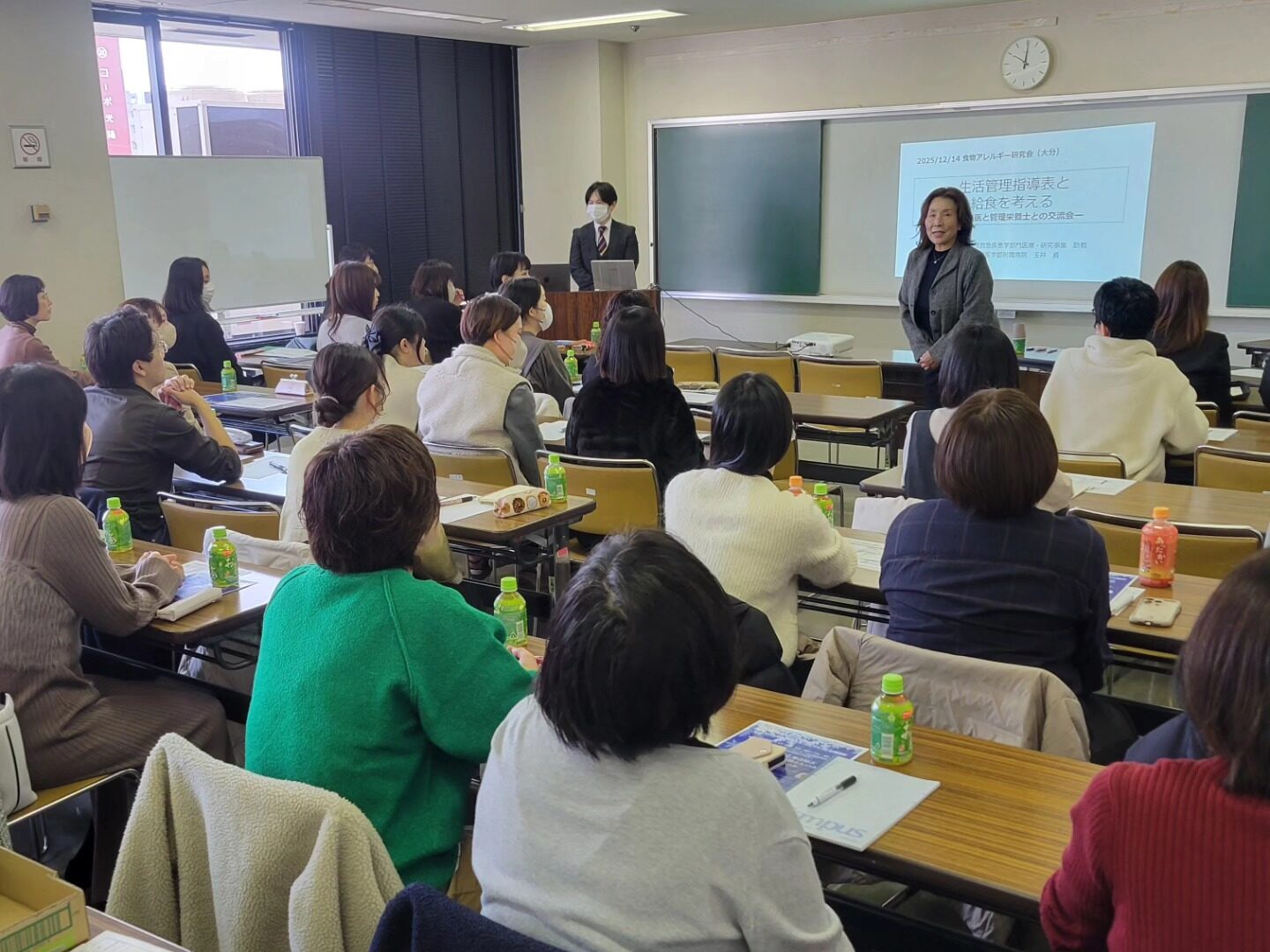 令和7年12月14日(日)、本学食物栄養学科ではコンパルホール(大分市)にて、「生活管理指導表と給食を考える」をテーマに公開講座を開催しました。当日は、県内の小児科医をはじめ、学校栄養士・栄養教諭、行政管理栄養士、教育委員会関係者、さらに本学の在学生および卒業生など、約50名が参加しました。
