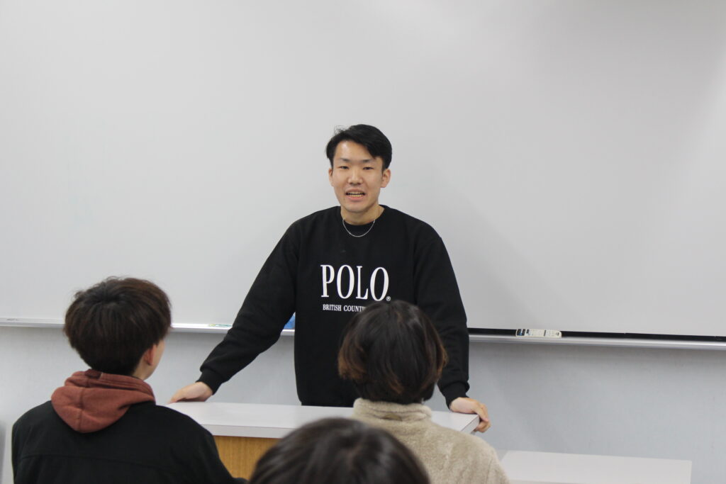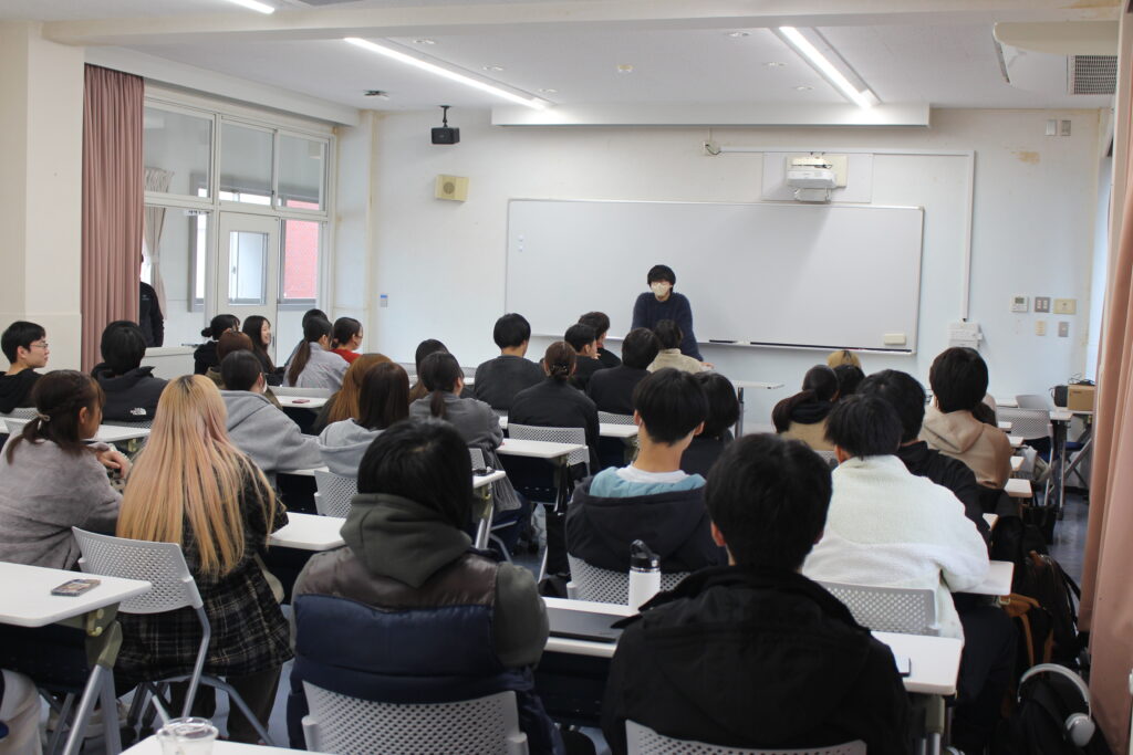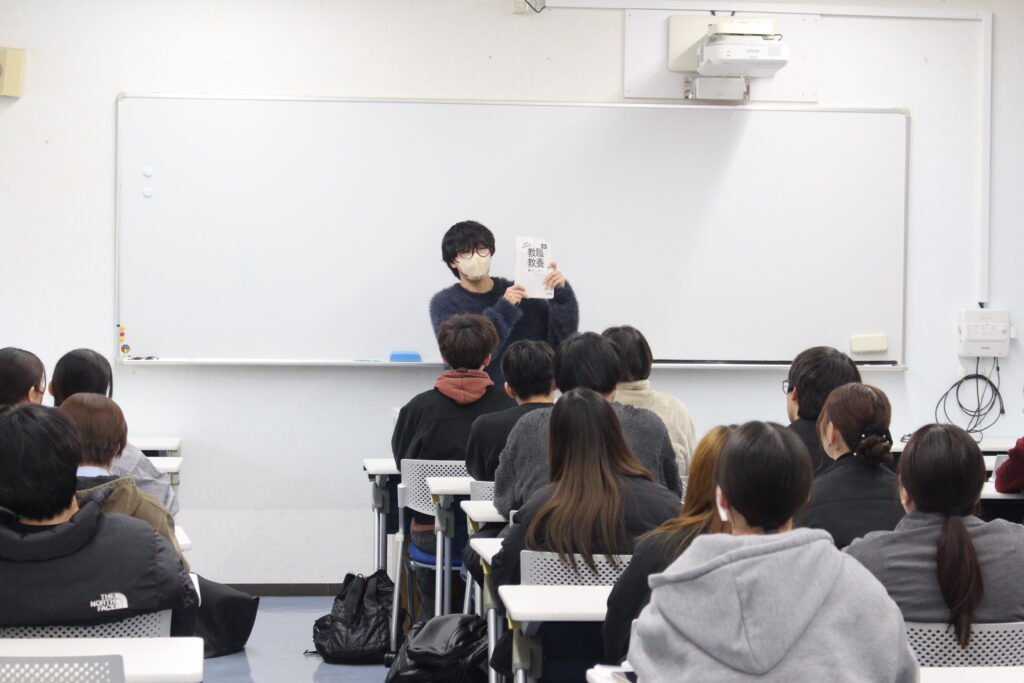 令和7年12月17日(水)、本学初等教育科の2年生及び専攻科1・2年生で、今年度の大分県教員採用試験に見事合格した学生が、来年度の受験を予定している1年生に向けてレクチャーを行いました。当日は47名が参加し、熱心に耳を傾けました。