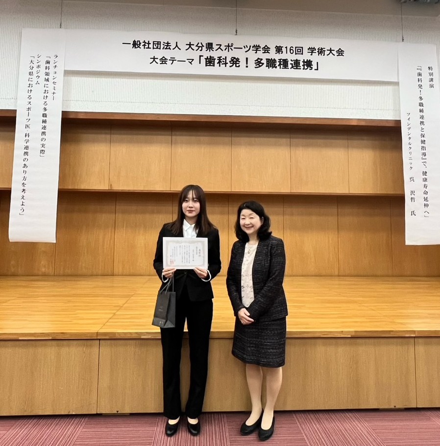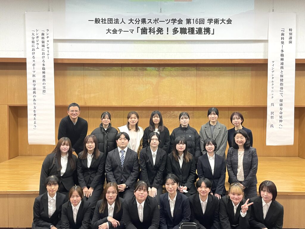 本大会では、大分県内でスポーツに関わる医療・教育・スポーツ現場の専門職による研究発表が行われ、本学食物栄養科学部 食物栄養学科の3・4年生も参加しました。
