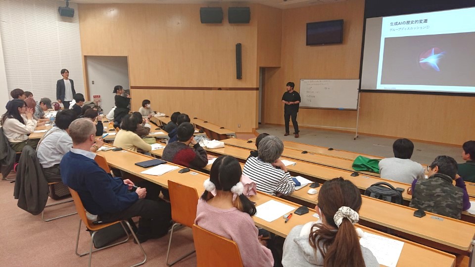 今回は「言語学から見た生成AI」をテーマに、言語学と情報科学の最前線でご活躍されている東京大学大学院の大関洋平先生をお迎えし、生成AIの発展の歴史から最新の研究動向まで幅広くご講演いただきました。生成AIがますます身近な存在となる中、国際言語・文化学科の学生だけでなく、他学科の学生や学外の方々にも多数ご参加いただきました。