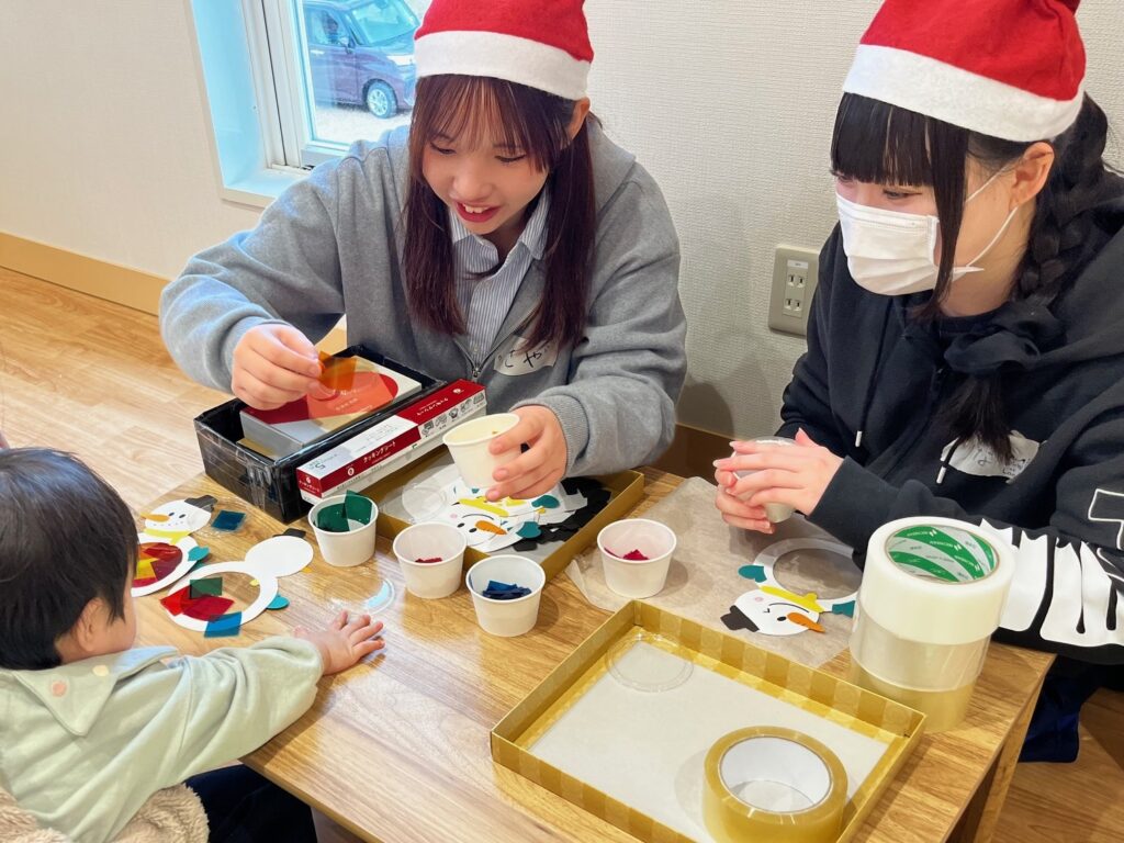 当日は、クリスマスをテーマにしたフォトスポットや、親子で楽しめる製作コーナー(雪だるま・リース)、ケーキ屋さんごっこコーナーなど、さまざまな遊びを学生が企画・準備しました。地域からは0~4歳のお子さまを連れた11組の親子が参加され、会場はクリスマスムードに包まれたにぎやかな雰囲気となりました。子どもたちや保護者の方々、そして学生たちの笑顔があふれ、温かな時間が流れました。