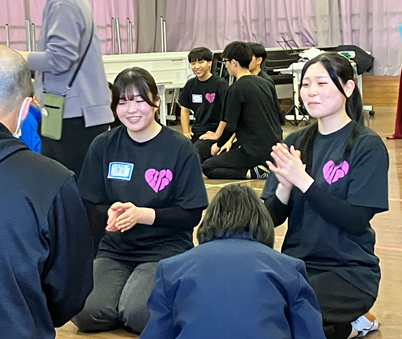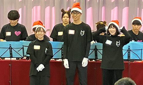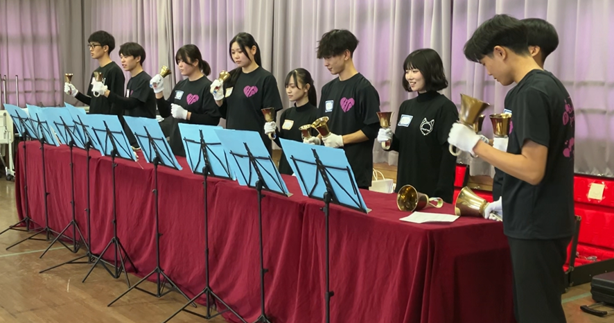 はじめに、両校の紹介を行い、それぞれの学校が大切にしている特色や教育目標について、スライドを用いながら紹介し合いました。続いて自己紹介ゲームの後、ハンドベル研究会の学生が演奏を披露し、支援学校高等部3年生にもハンドベル演奏を体験していただきました。学生が丁寧にタイミングを伝えながら一緒に奏でた演奏は、とても温かく素敵な時間となりました。まもなくクリスマスを迎えるこの日、会場にはベルの美しい響きと学生・生徒の笑顔があふれ、参加者全員が心温まる交流のひとときを過ごしました。