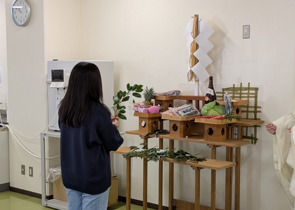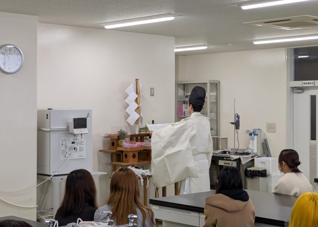 今回の慰霊祭では、火男火売神社より神主様をお招きし、祝詞奏上などの神事が厳かに行われました。なお、神主様は本学食物栄養科学部食物栄養学科の第17期生でもあり、卒業生がこのような形で学科に関わってくださったことは、深いご縁を感じる機会となりました。