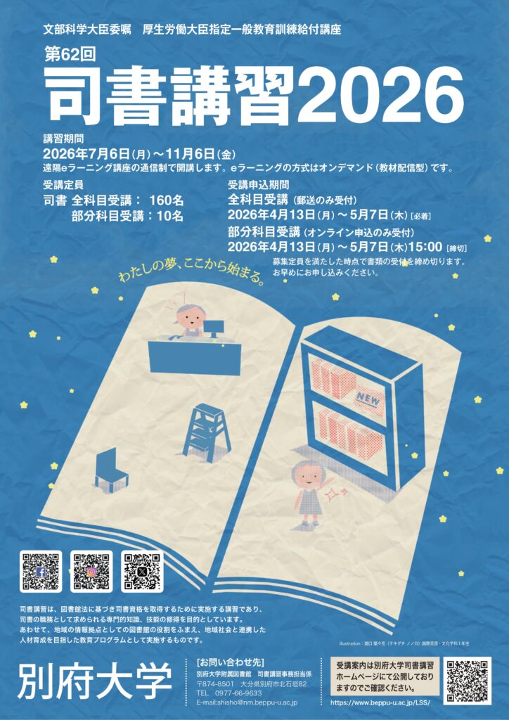 ※2026年度司書講習ポスターのイラストは本学学生が制作しました。(文学部 国際言語・文化学科 1年 瀧口 暖々花さん)