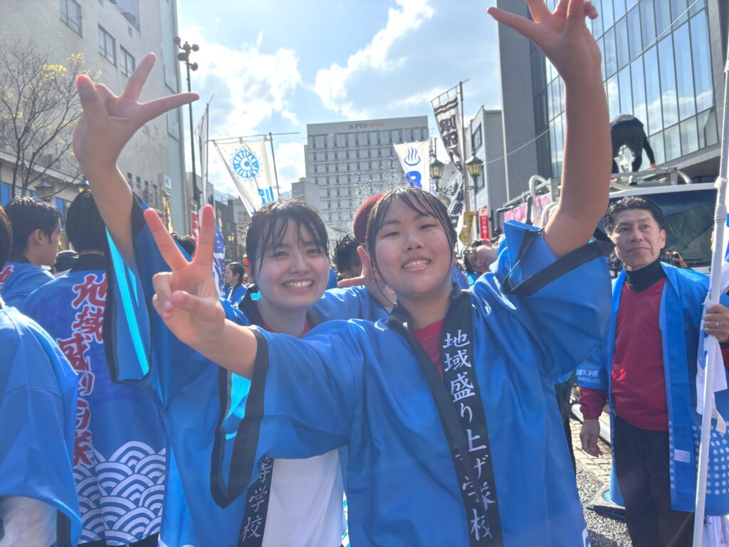 別府市に春の訪れをつげる「第112回別府八湯温泉まつり」が令和8年4月1日(水)から5日間、別府市内の各会場において開催されました。4月5日(日)にはメインイベントである「湯♨ぶっかけまつり」が開催され、本学より学生有志25名と明豊高校の「地域盛り上げ隊」8名の総勢33名が参加し、学生・生徒・教職員が一体となって祭りを盛り上げました。