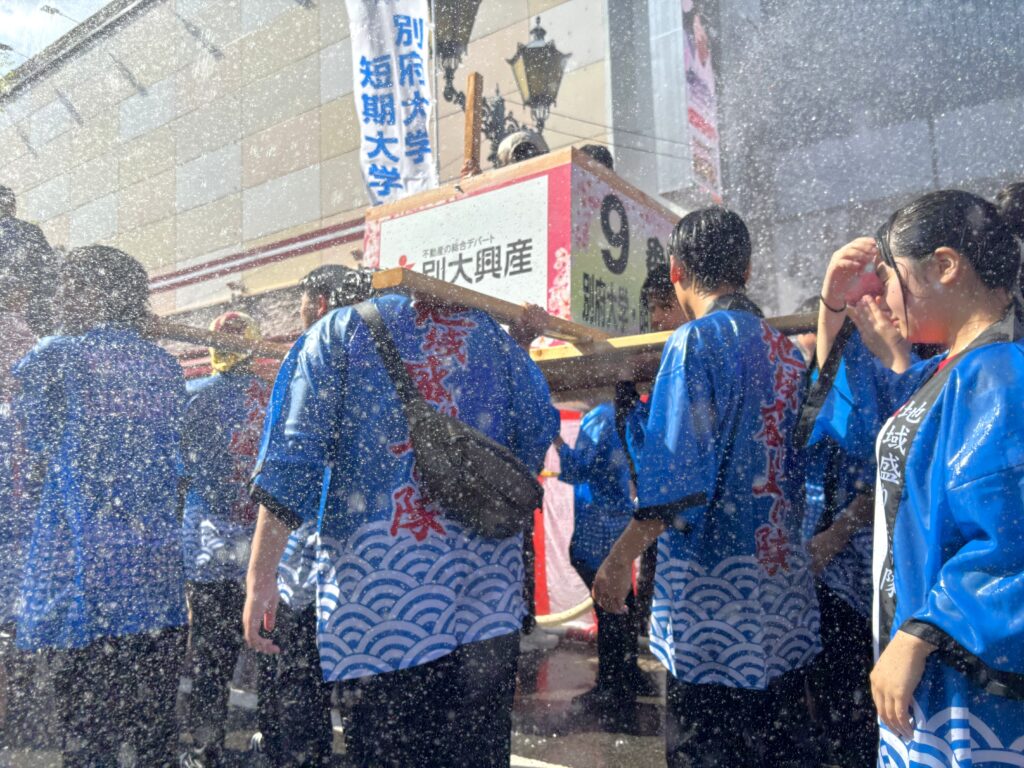 今年は過去最多となる213トンの温泉が用意され、参加者は「みこし道中」を担ぎながら豪快に湯を浴びました。はじめは湯量の多さに驚きつつも、別府八湯の湯を浴びながら練り歩くうちに音楽に合わせて歌ったり踊ったりと笑顔溢れる空間となりました。