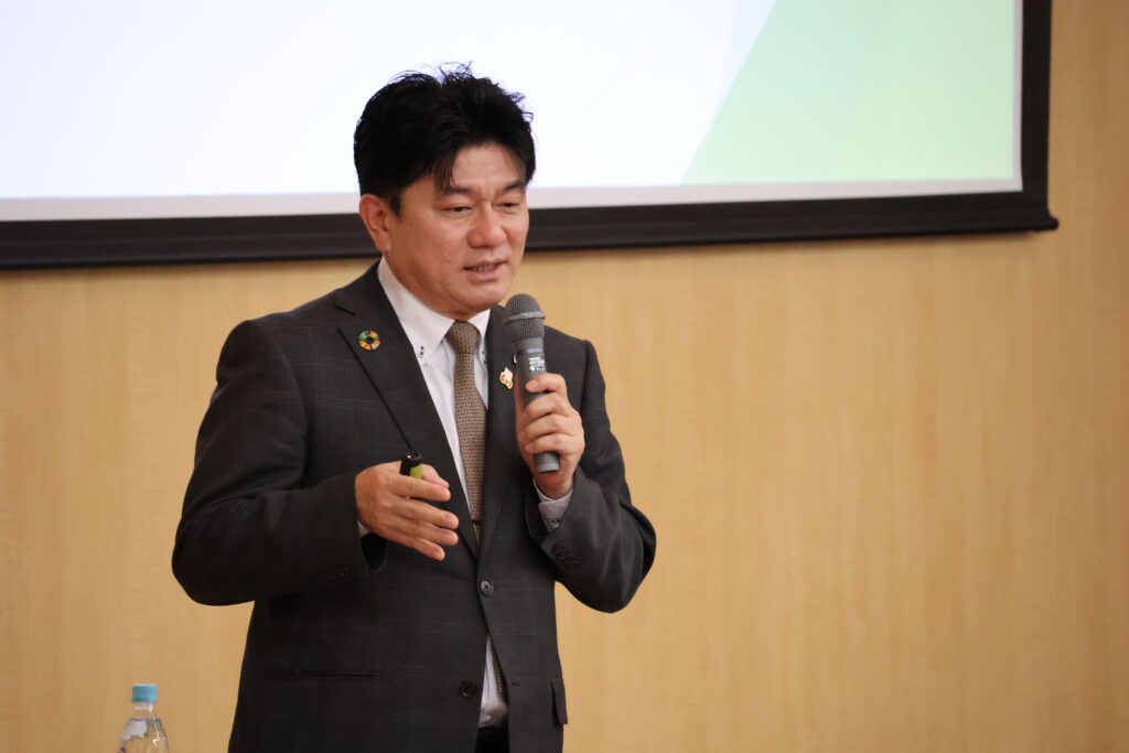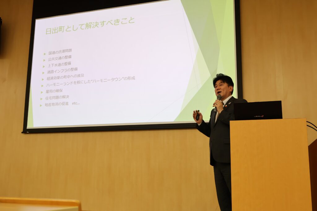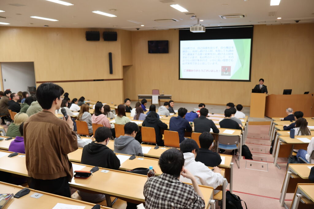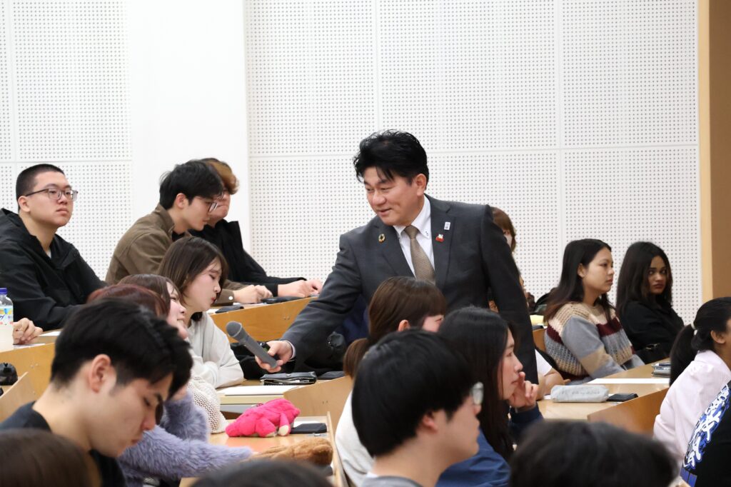 講話では、国際経営学部の学生を対象に、「SDGs未来都市を目指す日出町と実現に向けて求められる人財とは?」をテーマとして、日出町の取り組みや地域行政に求められる人材像についてご講演いただきました。学生にとって、自治体行政や地域づくりへの理解を深める貴重な学びの機会となり、講話後には学生から多くの質問が寄せられるなど、有意義な授業となりました。