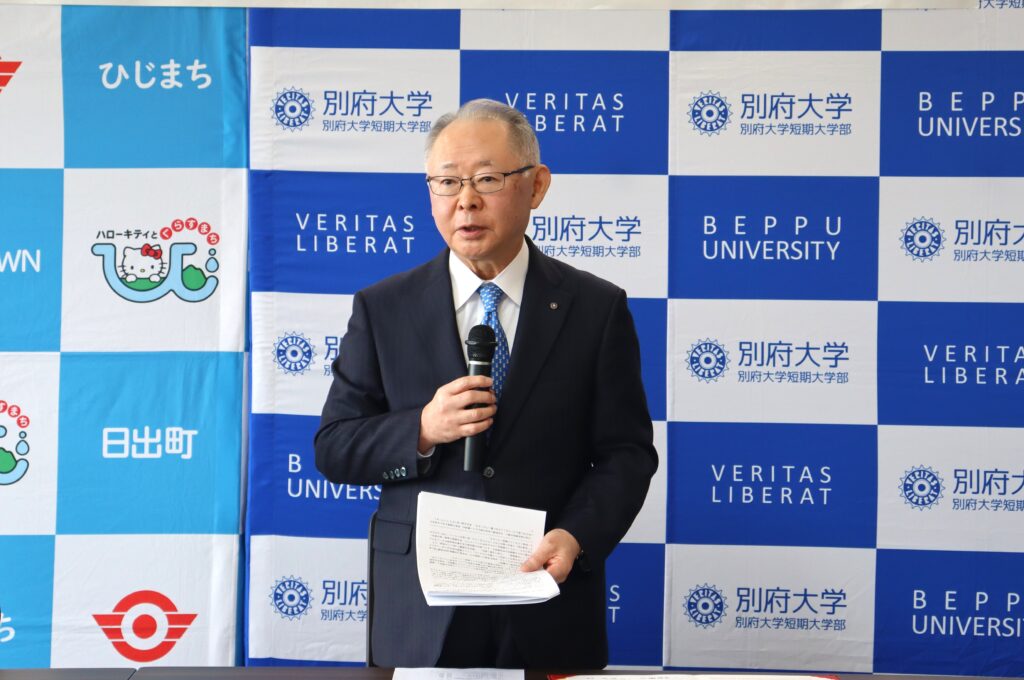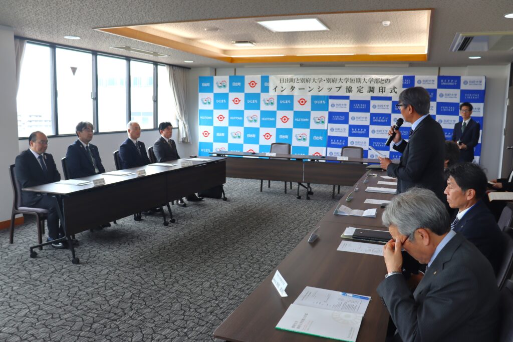 「現在、高等教育においてインターンシップは、単なる就業体験ではなく、学生が将来の職業観を形づくる重要なキャリア教育の柱となっています。大学で学んだ知識が現場でどのように生かされ、社会課題の解決につながるのかを実感できる貴重な機会です。本学でも公務員志望の学生が増えており、今回の協定により、先進的な取り組みを行う日出町で学べることは、学生にとって大きな財産になると期待しています。」と挨拶がありました。