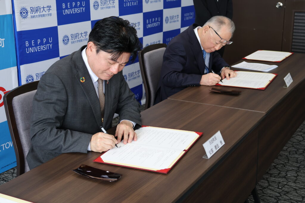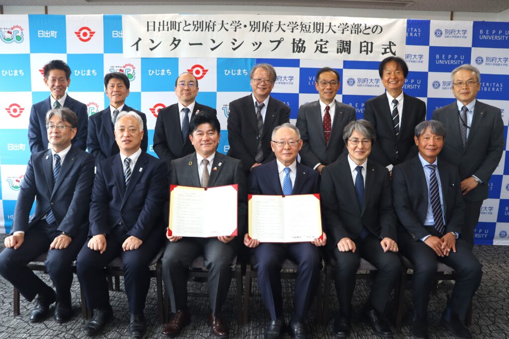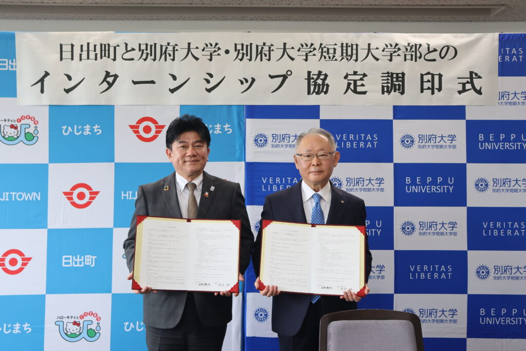 令和8年4月22日(水)、別府大学および別府大学短期大学部(以下、本学)において、「日出町と別府大学・別府大学短期大学部によるインターンシップに関する協定調印式」を執り行いました。