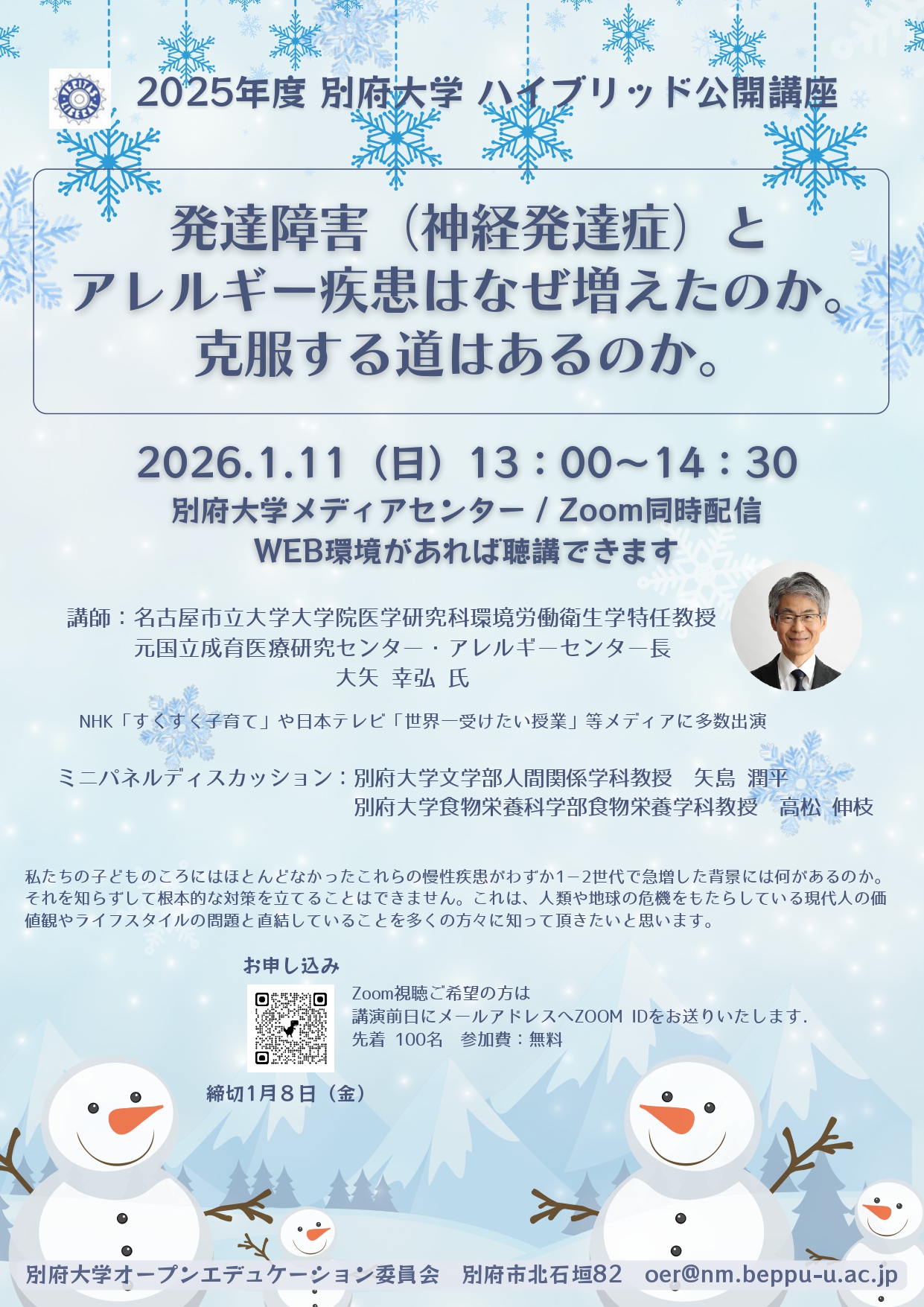 別府大学オープンエデュケーション委員会では、発達障害(神経発達症)やアレルギー疾患の急増という現代的課題をテーマとした公開講座を開催します。
